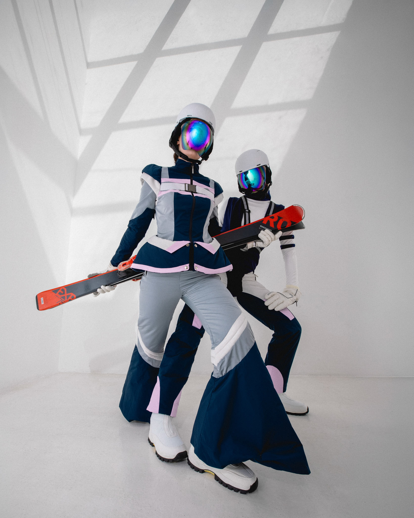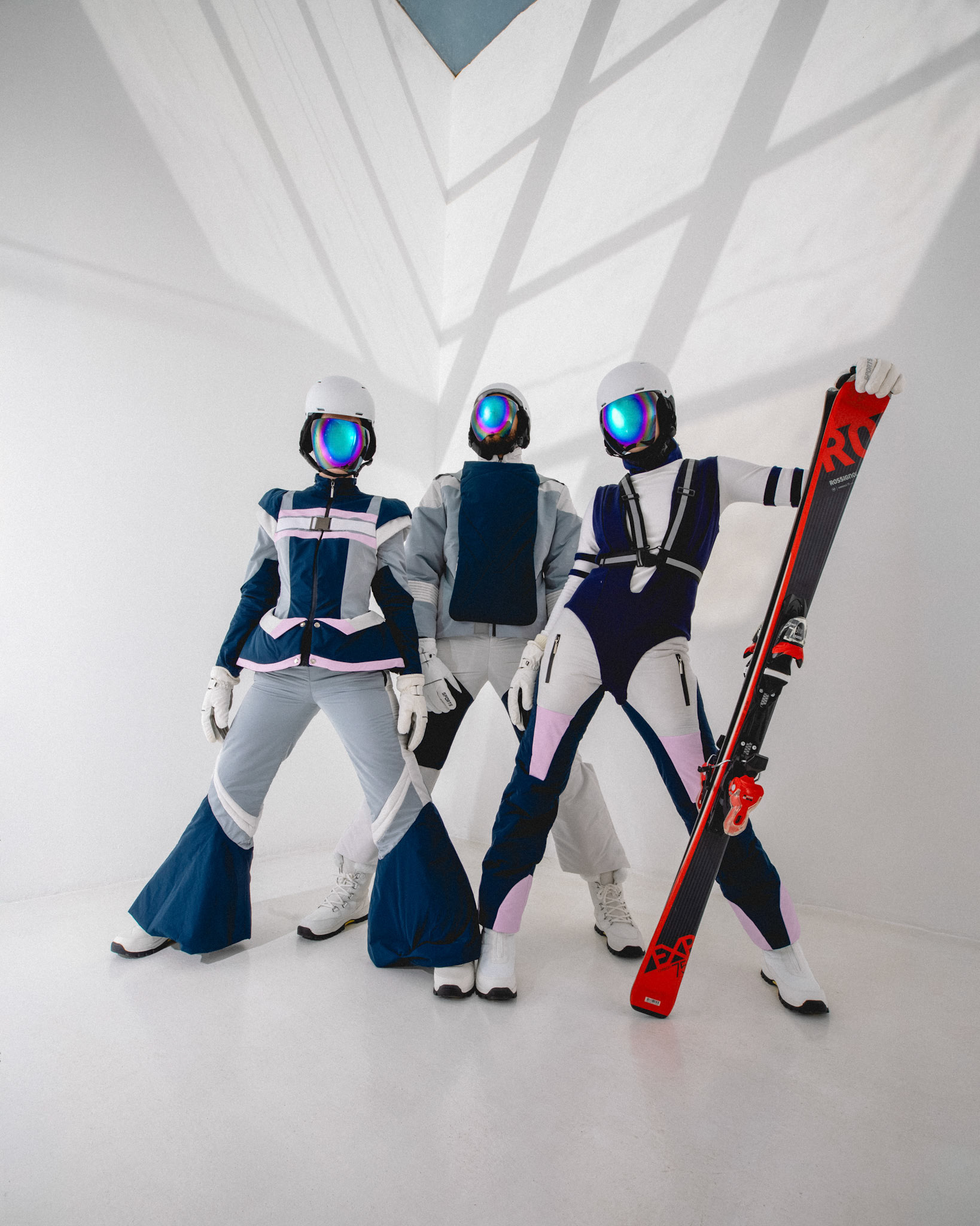 Snow -phoria is a ski wear collection that captures the essence of modernity with bold silhouettes and a sophisticated color palette. It merges modern elegance with a bold, futuristic allure, turning the slopes into a canvas for avant - garde fashion-a statement of style for the future-forward. AI has been integrated throughout the design process, enhancing innovation and precision in every piece. To prioritize both style and safety, GPS trackers have been incorporated within the garments, ensuring functionality alongside aesthetics. Additionally, cutting - edge modern textile manipulation techniques have been utilized, pushing the boundaries of fabric innovation to create a truly unique and forward -thinking collection.
